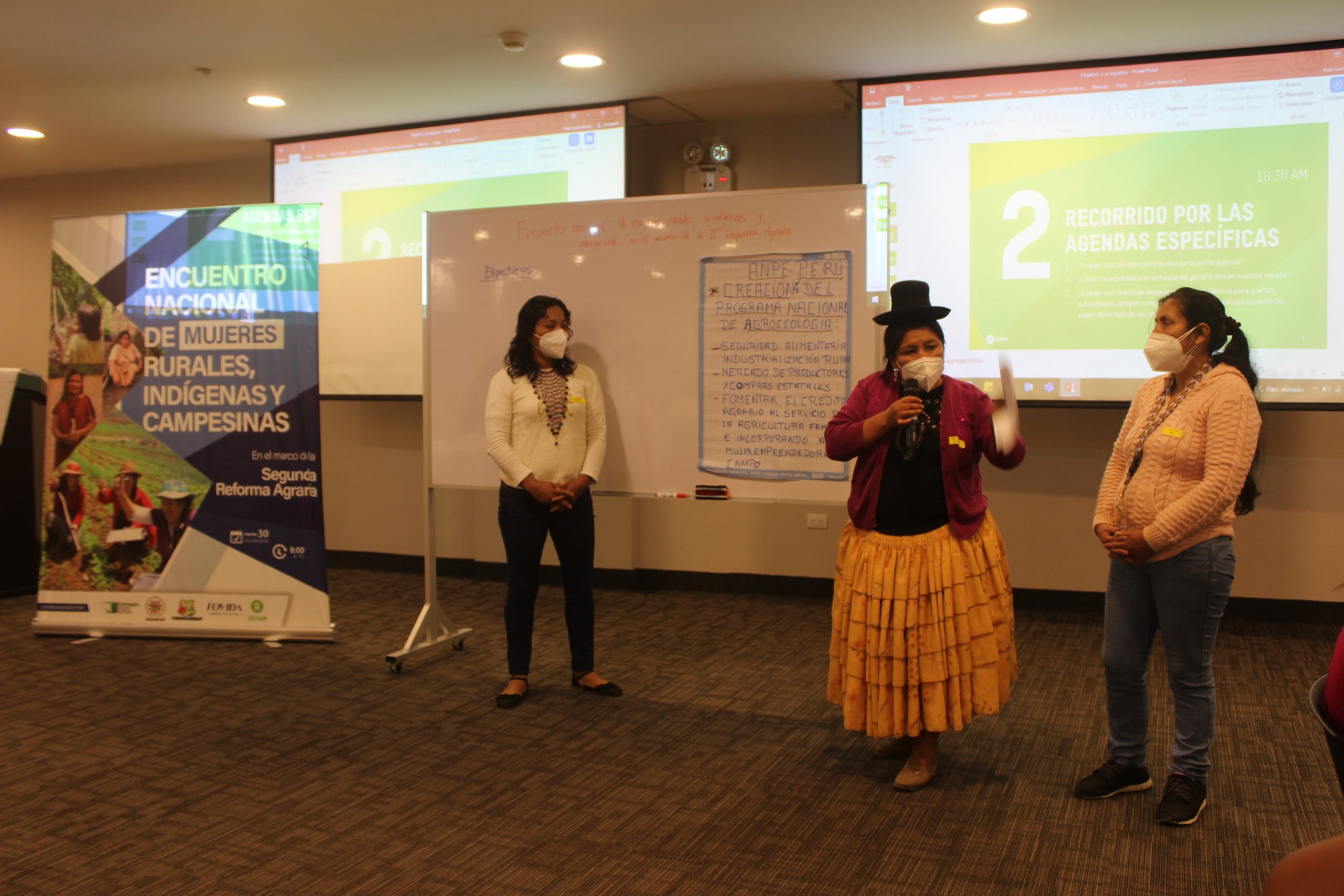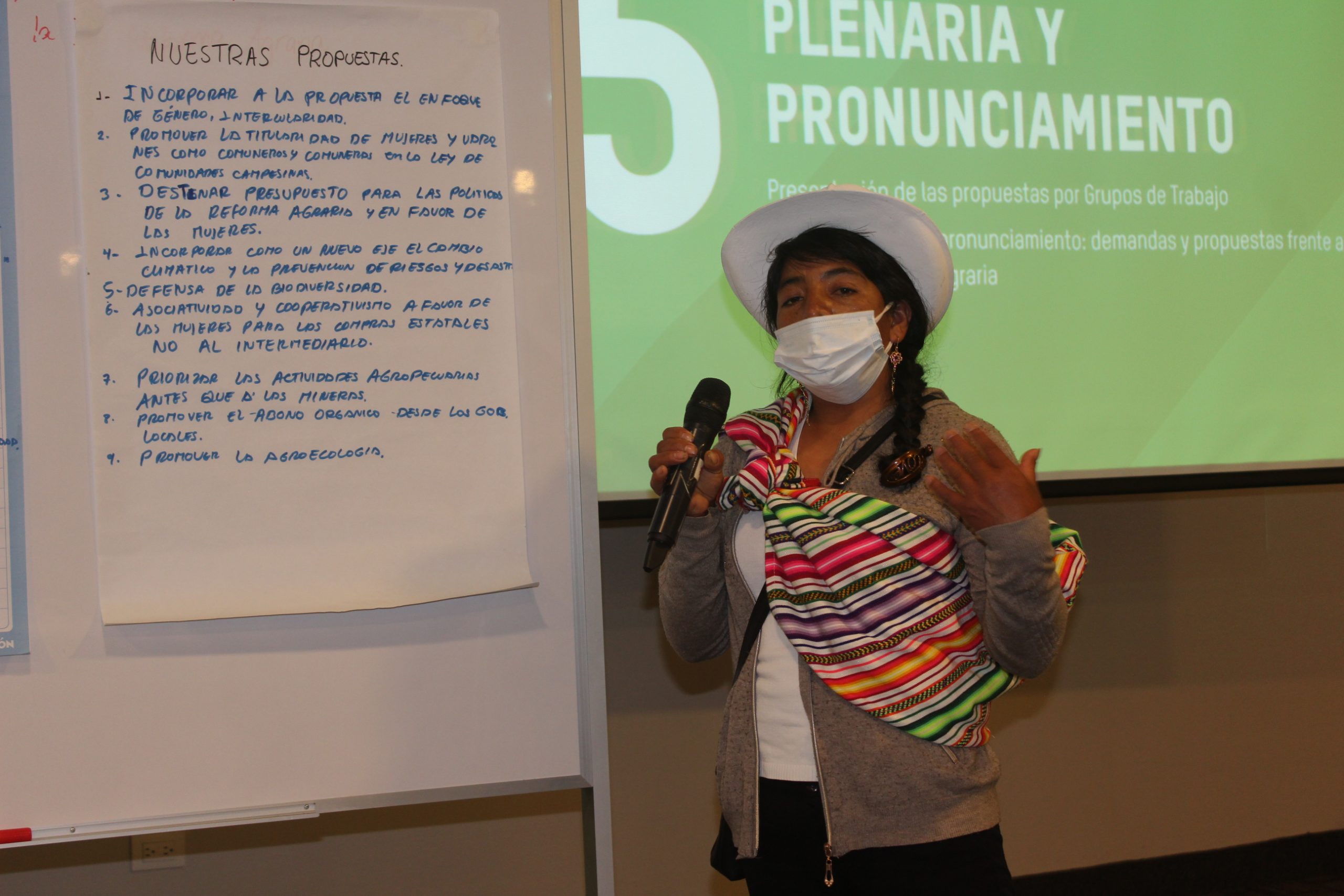 Cabe precisar, que las participantes también señalaron que “en el mundo andino el dinero no tiene valor, sino que prima la soberanía alimentaria”, por ello la reforma agraria debe fortalecer la agricultura familiar y teniendo en cuenta las necesidades de las mujeres ya que, el 30% de las unidades agrícolas (UA) son manejadas por ellas.