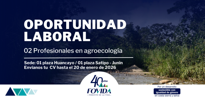 Enviar CV a los correos: billy@fovida.org.pe; mcuentas@fovida.org.pe indicando en el asunto al cargo al que postula. Por ejemplo: Profesional en Agroecología – Huancayo.